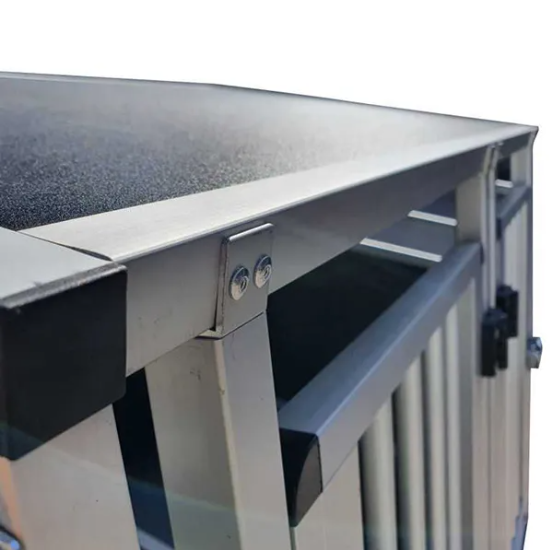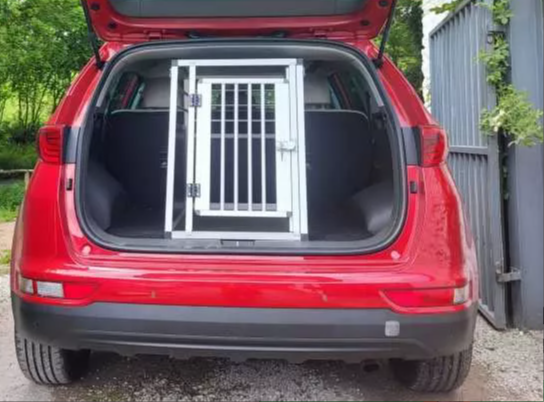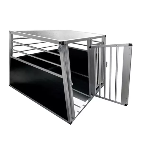 Jaula de alumínio para cães que contribui para uma viagem segura e confortável. É adequada para ser usada no porta-malas do seu carro.